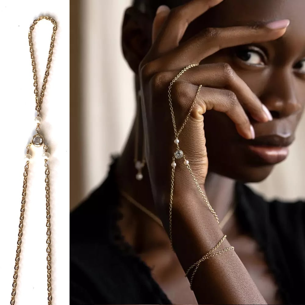 Ce splendide bracelet de doigt, appelé également Bracelet bague ou chaine de main, est un bijou peu commun qui est devenu un incontournable de la mode depuis quelques mois qui peut se révéler d’une délicatesse et d’un raffinement exquis!