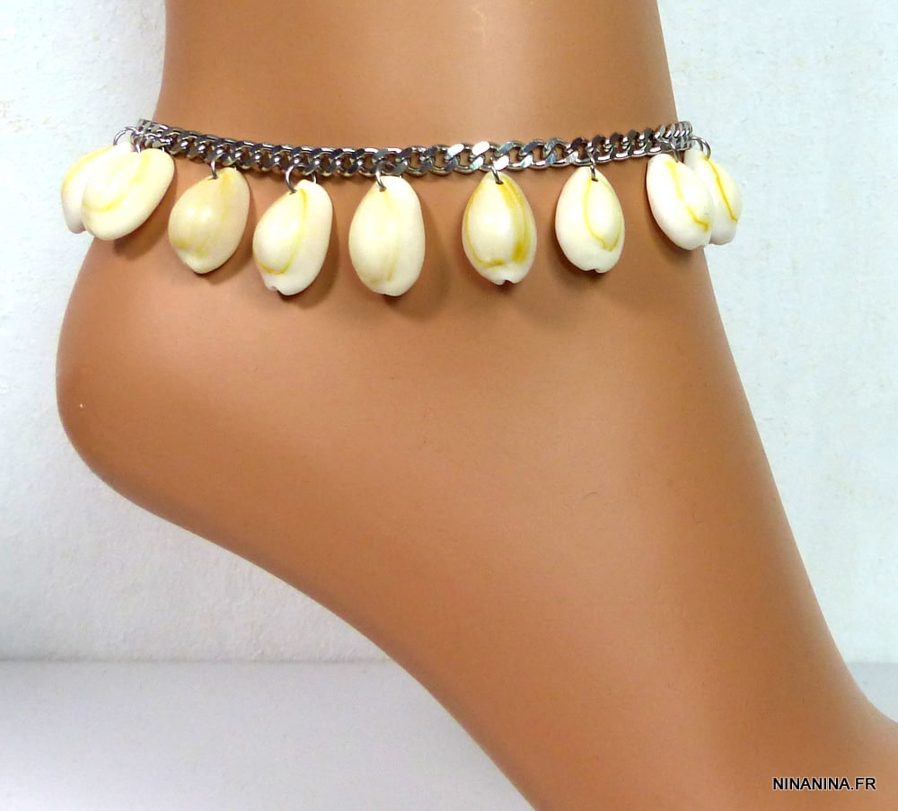 Bracelet biceps femme coquillages cauris Acier argent composé de coquillages grain de café montés sur une chaine en acier inoxydable.
