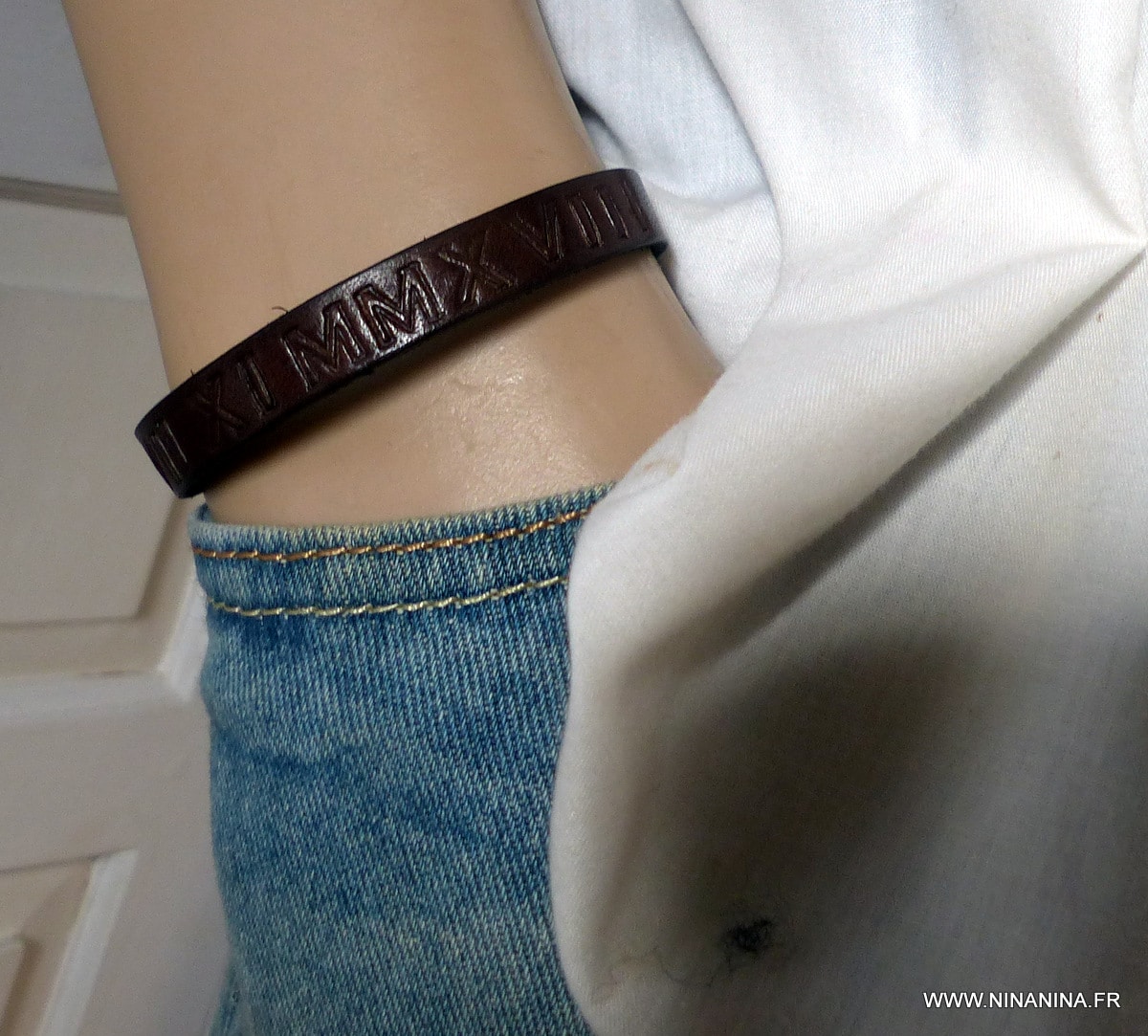 Ce Bracelet chiffre romain luxe cuir gravé personnalisable va vous combler à coup sûr ! Composé d’une lanière de cuir gravée de chiffres romains (10 mm de large) terminée par un fermoir en acier inoxydable, ce Bracelet homme personnalisé enlacera votre poignet avec classe et délicatesse.