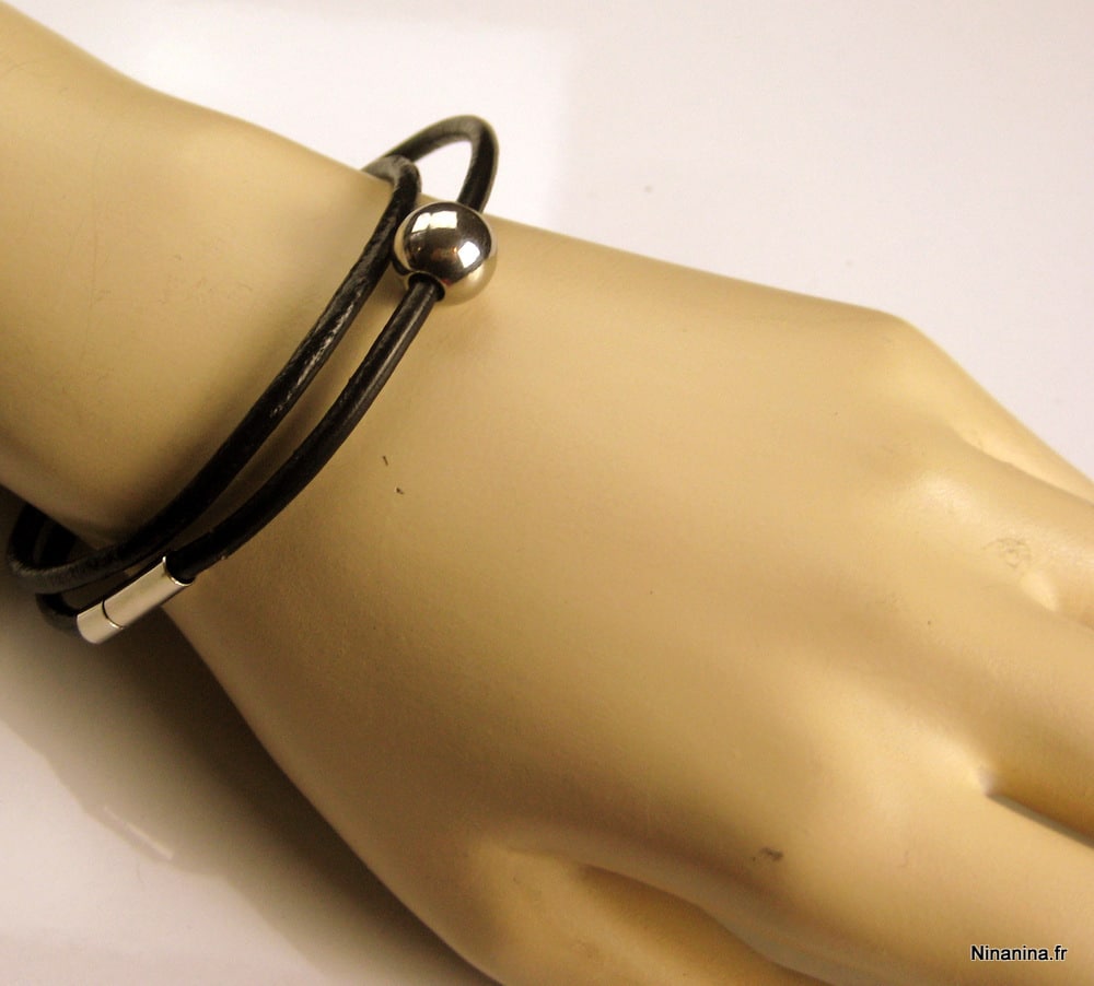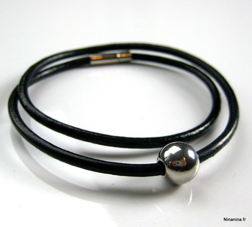 Bracelet cordon cuir boule Acier double tour femme composé d’une perle ronde en acier inoxydable montée sur un lien de cuir noir (3 mm de diamètre) à enrouler autour du poignet. Dim de la perle : 1 X 0,9 cm. Fermoir cylindrique en acier inoxydable. Longueur : de 15 à 20 cm env réglable. Livré dans sa pochette d’organza. Bijou 100% fait main.