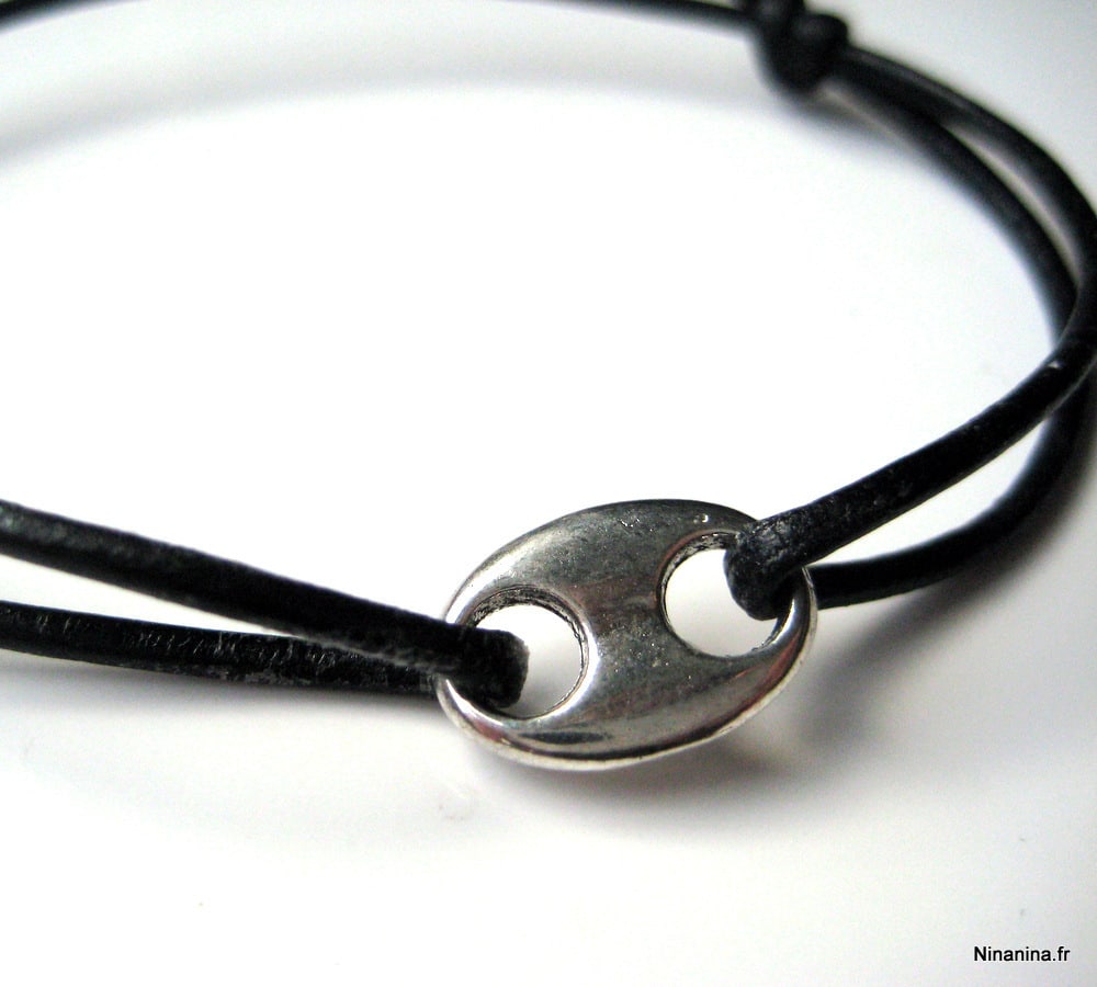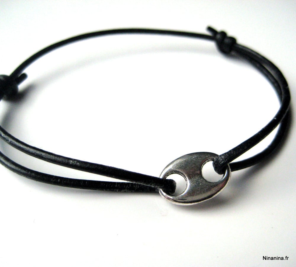 Bracelet cordon cuir composé d’un connecteur grain de café en métal argenté monté sur un cordon de cuir noir (2 mm de diamètre). Existe en noir, marron chocolat, gris, bleu turquoise, rose foncé et naturel. Dim de l’anneau : 1,1 X 1,6 cm. Fermeture par liens coulissants. Longueur : de 17 à 24 cm réglable. Livré dans sa pochette d’organza. Bijou 100% fait main.