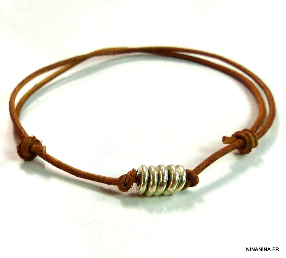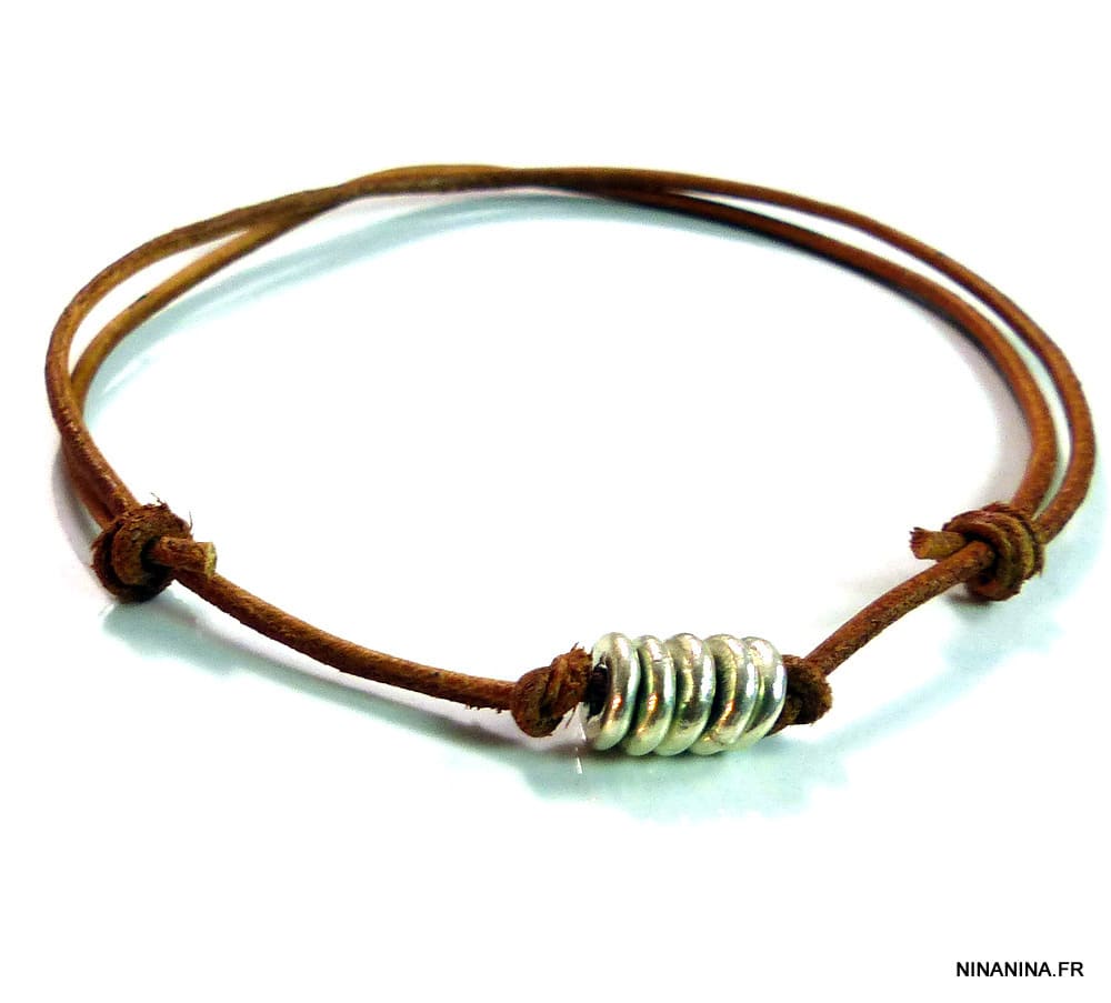 Bracelet cordon cuir femme ou homme Argent 925 composé de 5 disques en argent 925 montés sur un cordon en cuir naturel (1,5 mm de diamètre).