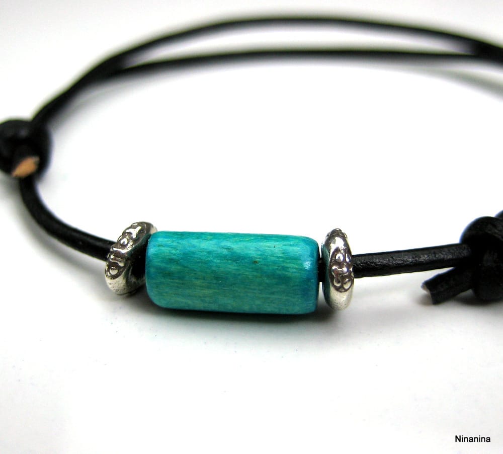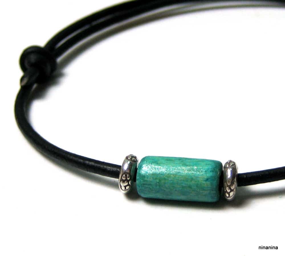 Bracelet homme argent massif bois et cuir composé d’une perle en bois turquoise et de 2 rondelles en argent 925 montées sur un cordon en cuir noir (2 mm de diamètre).
