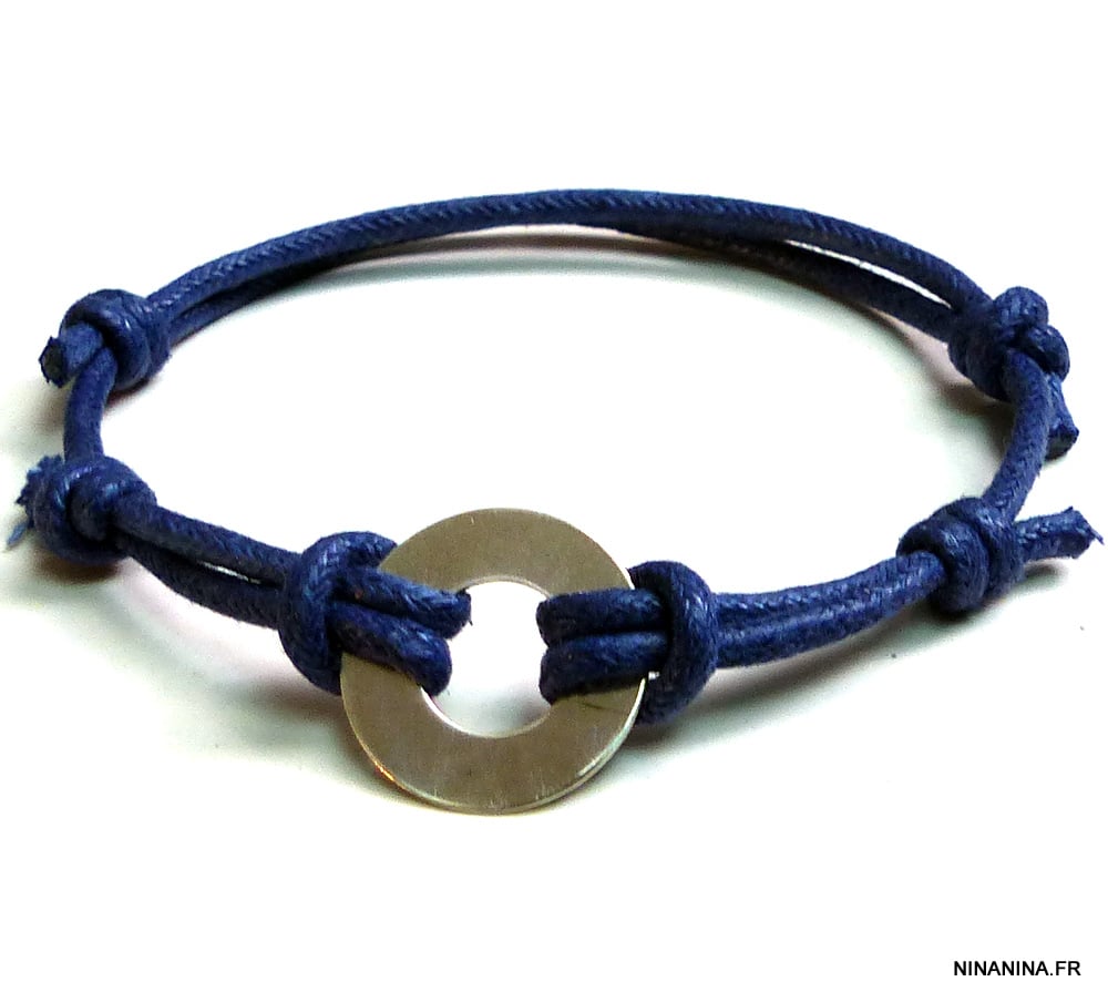 Bracelet homme cordon cible argent massif composé d’une cible ronde en argent 925 montée sur un cordon de coton ciré bleu nuit.