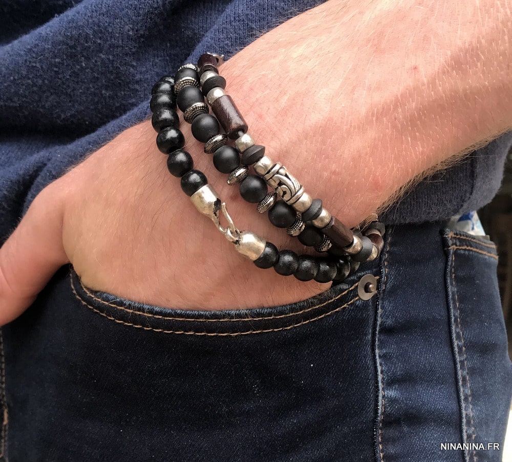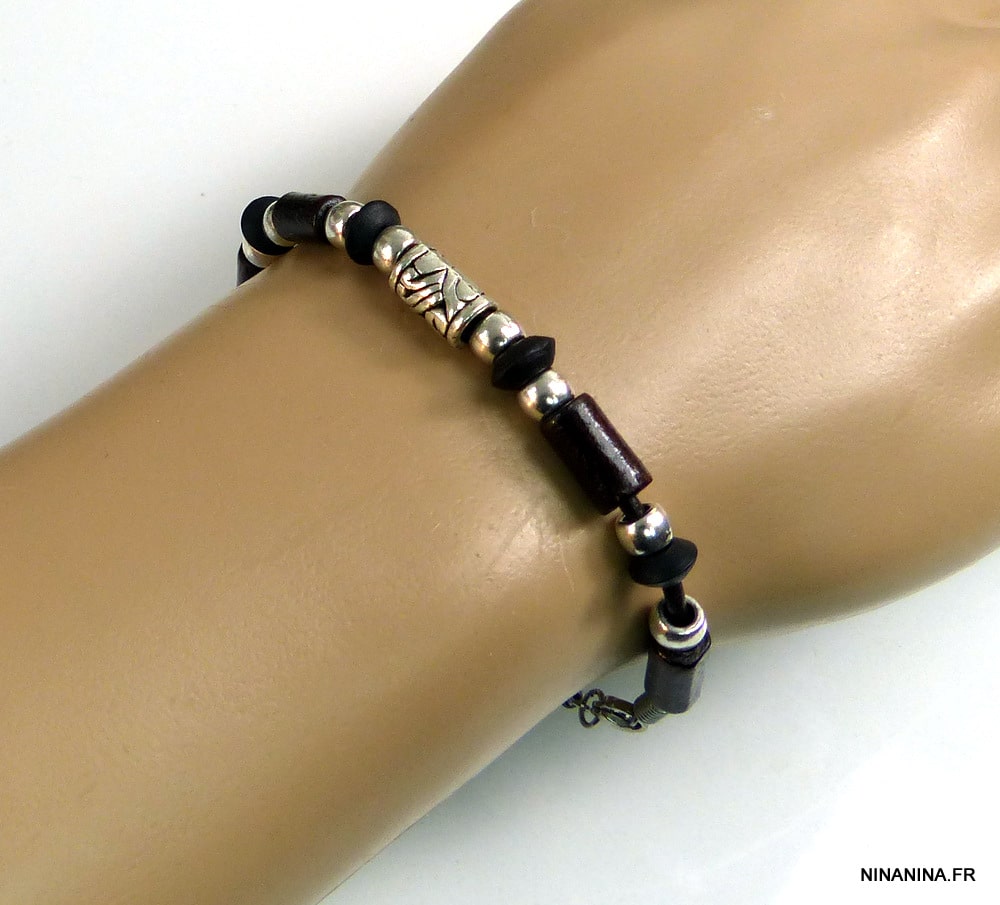 Bracelet homme perles bois marron et argentées cordon cuir composé de rondelles et tubes en bois noir et métal argenté montés en alternance sur un cordon de cuir noir