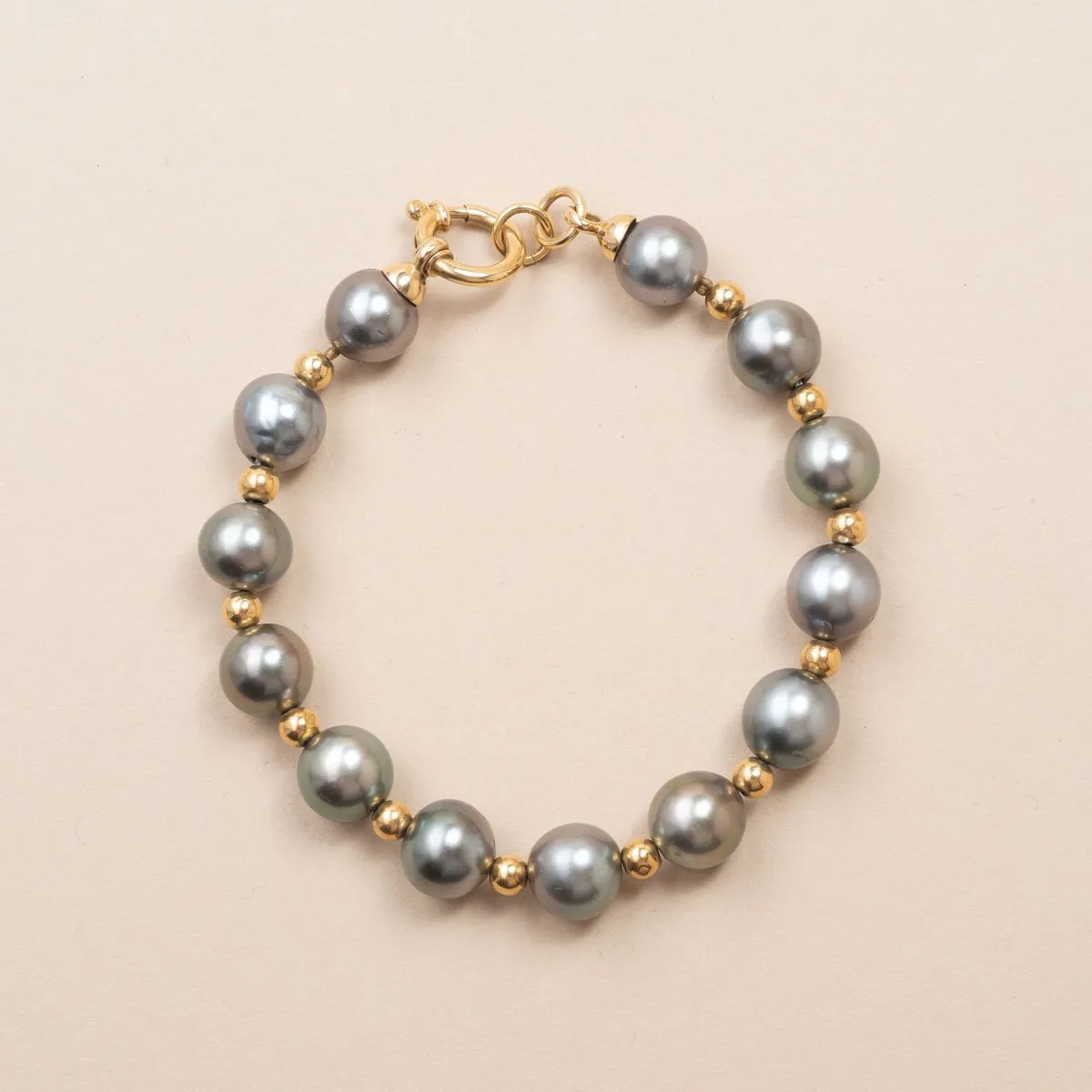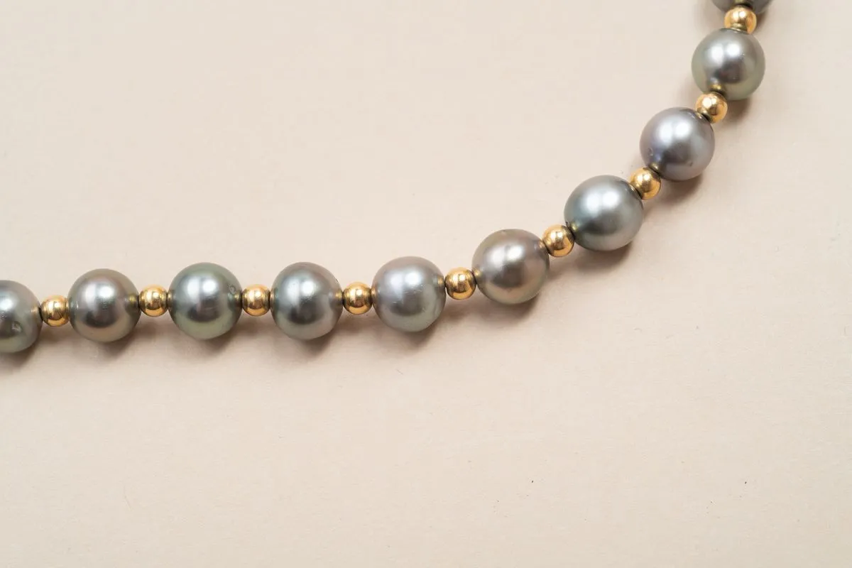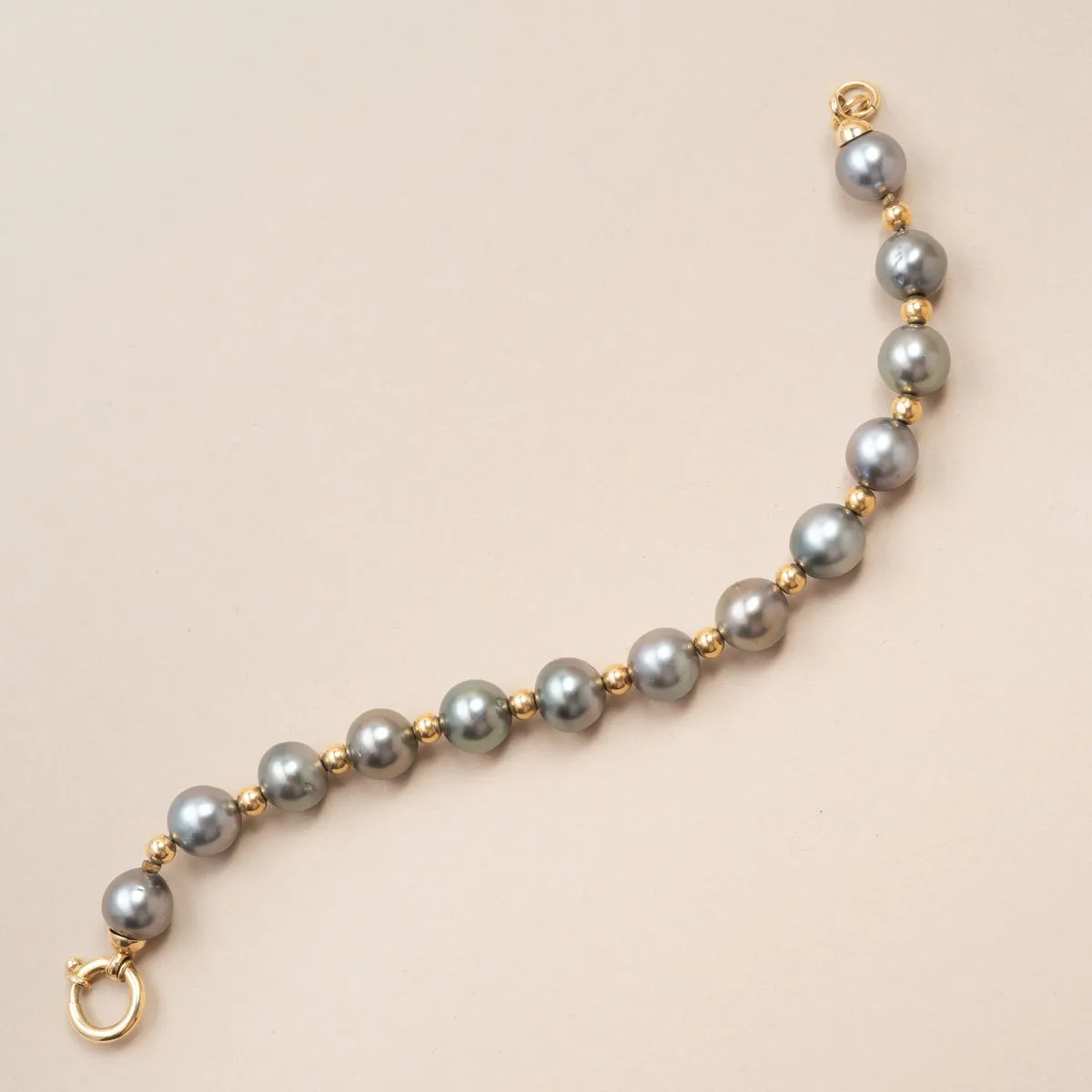 Bracelet or jaune 750/°°° ponctué de perles de culture grises des mers du sud séparées entre elles par des billes d’or et terminé par un fermoir anneau ressort.