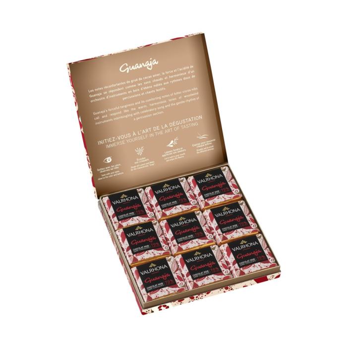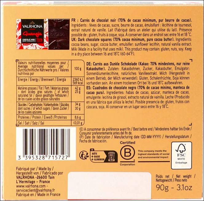 | Ingrédients | fèves de cacao, sucre, beurre de cacao, émulsifiant : lécithine de tournesol, extrait naturel de vanille. |