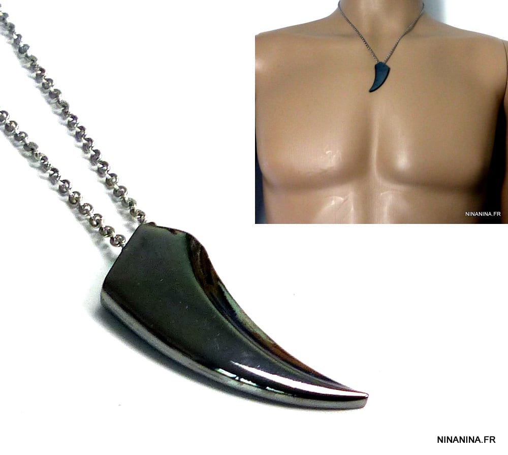 Collier dent de requin hématite acier inoxydable composé d’un pendentif dent de requin en hematite noire montée sur une chainette en acier inoxydable. Dim du pendentif : 4,5 x 2 cm. Fermoir mousqueton. Longueur : 50 cm env. Livré dans sa pochette d’organza.