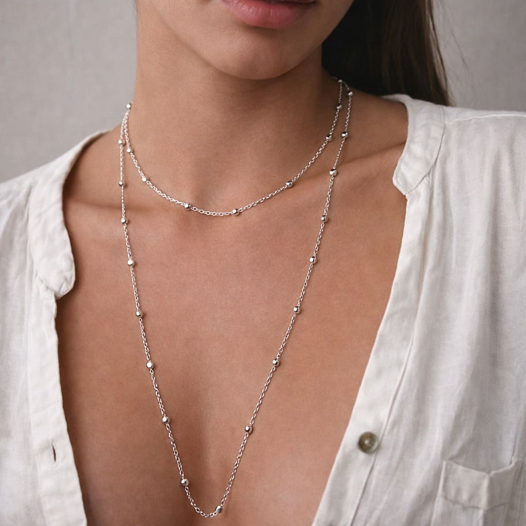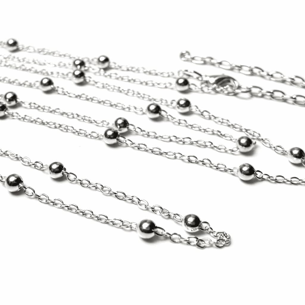 Les perles en acier inoxydable argenté apportent un éclat subtil et régulier tout au long de la chaîne. Leur finition lisse capte la lumière avec discrétion, donnant au collier un rendu chic et intemporel.