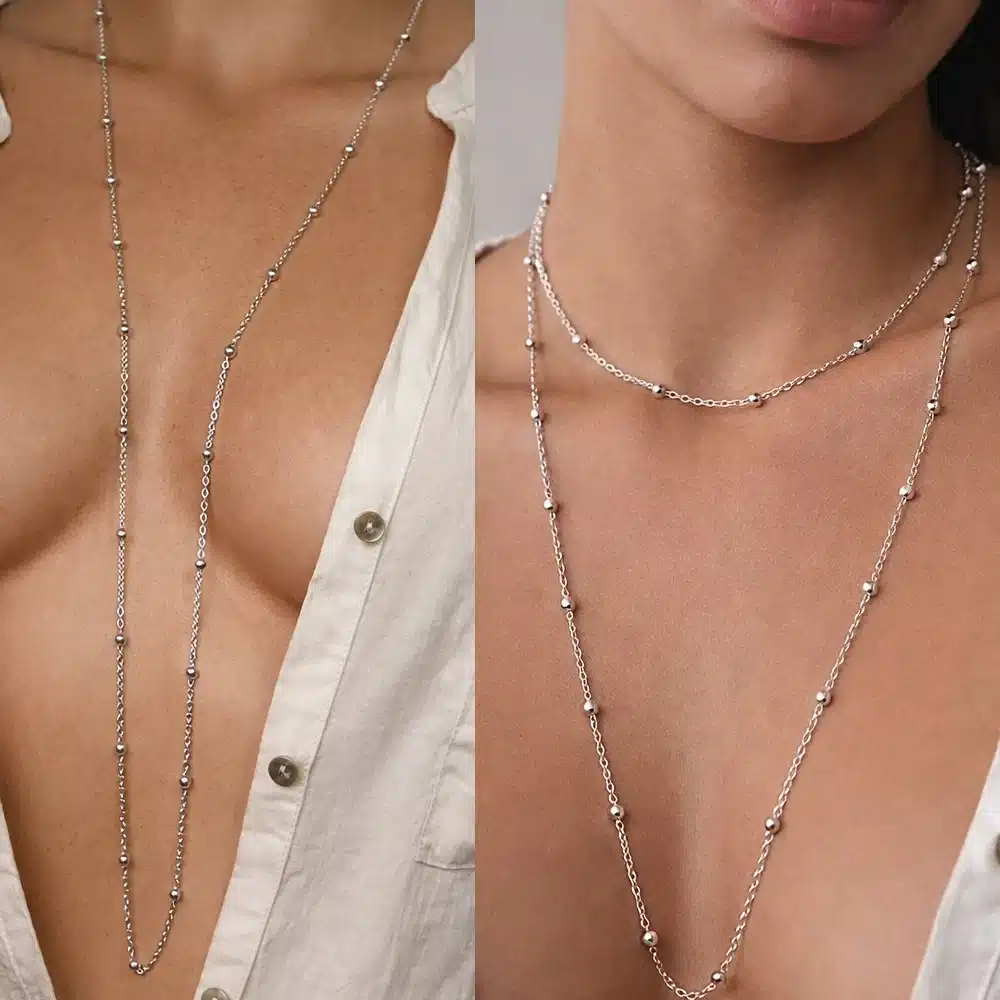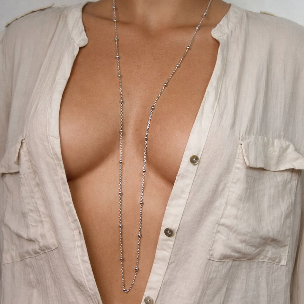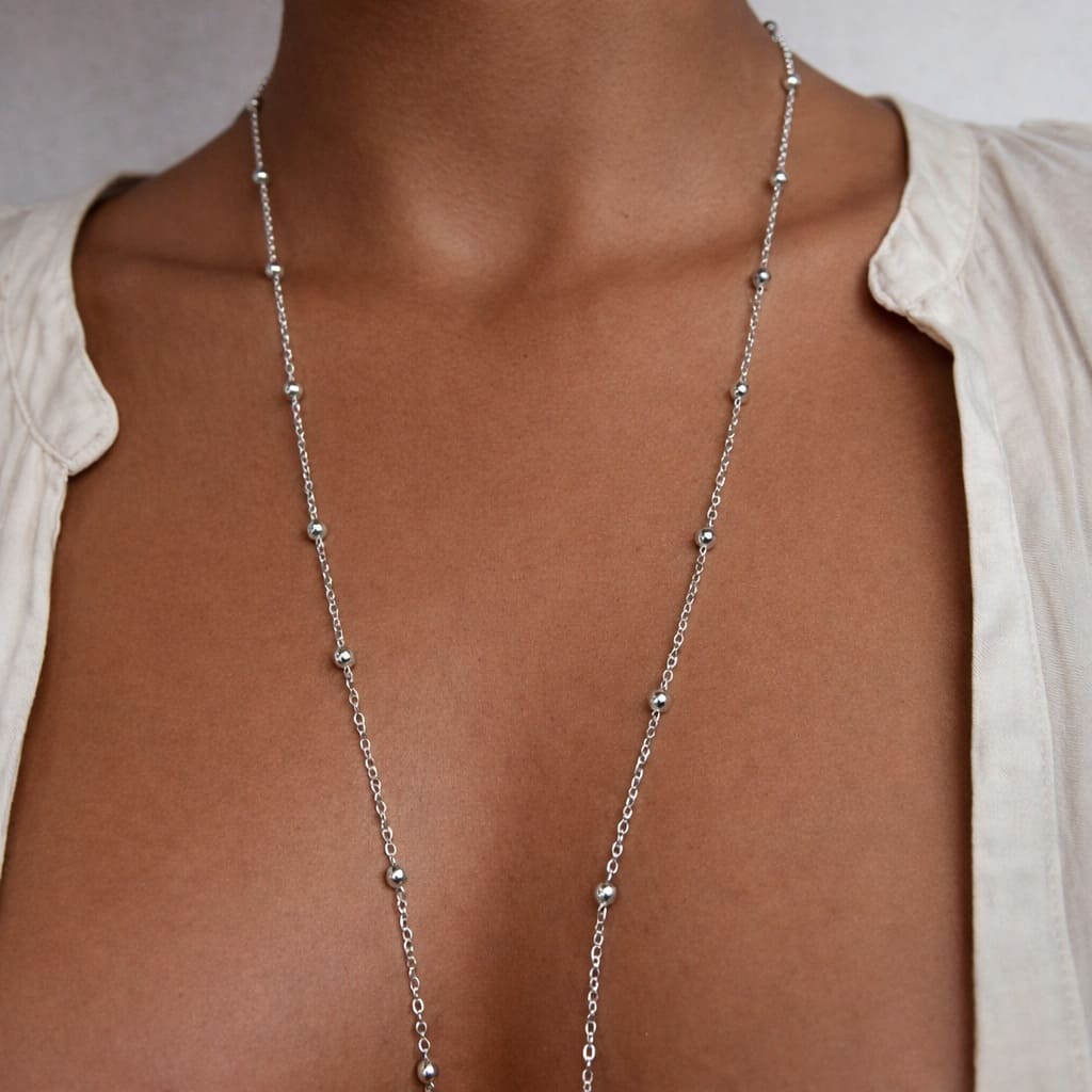 Portez ce collier argenté en sautoir long sur une blouse, une robe ou un pull pour allonger visuellement la silhouette. Il se prête parfaitement au jeu des superpositions avec des colliers plus courts pour un look moderne et tendance. Vous pouvez également le porter en double tour pour varier les styles, du plus épuré au plus sophistiqué.