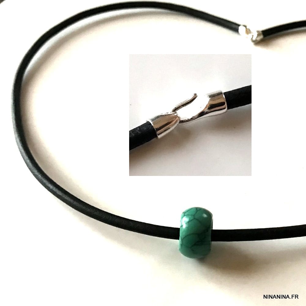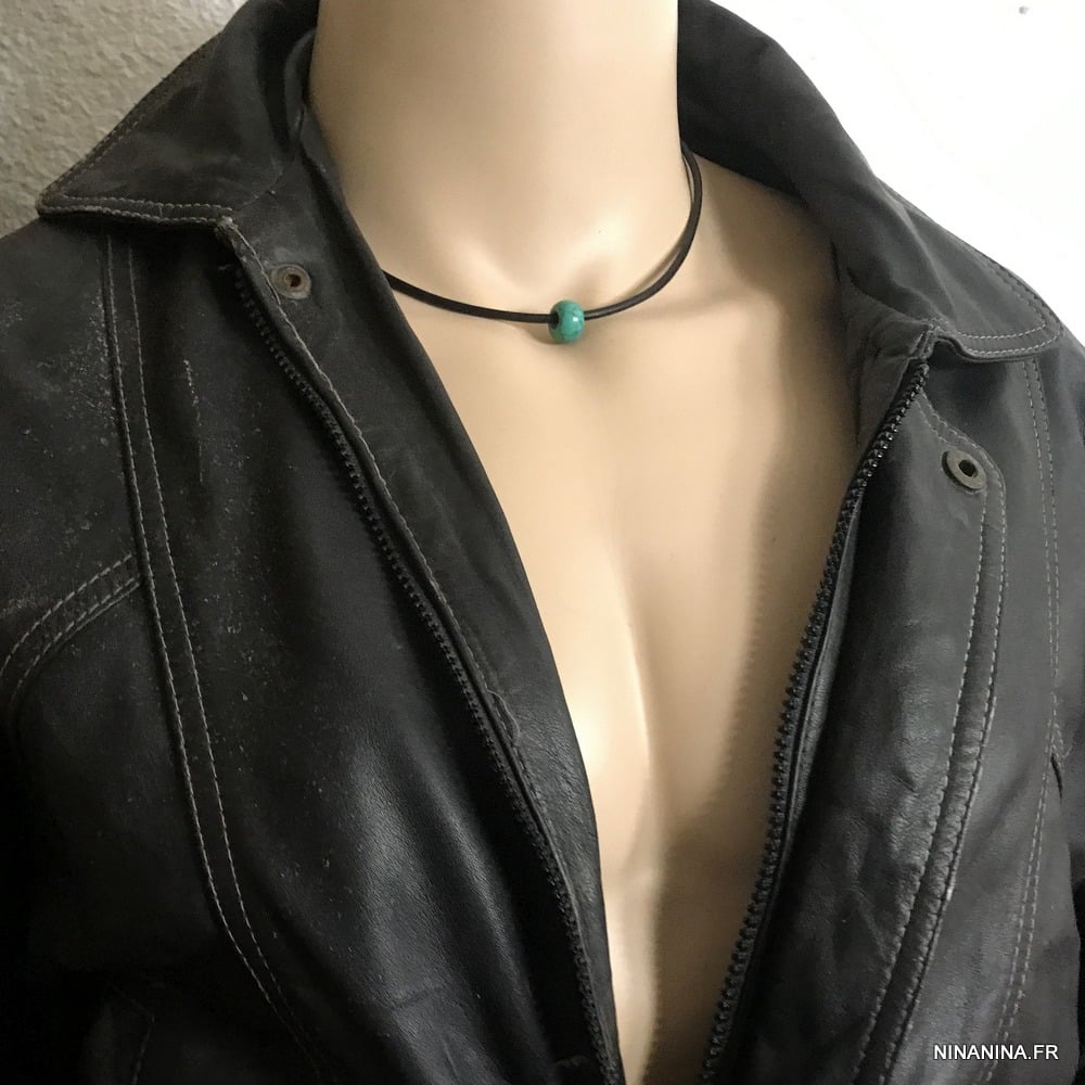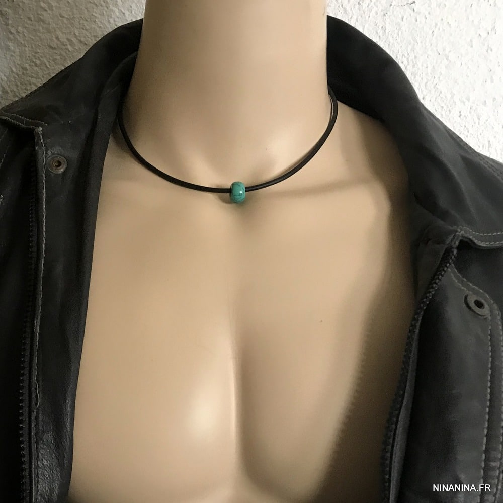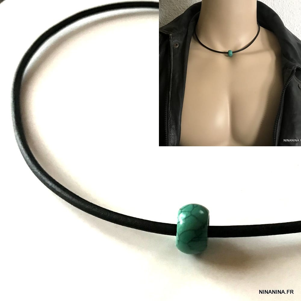 Collier grosse perle homme turquoise bleue cordon cuir composé d’une perle en turquoise naturelle montée sur un cordon en cuir noir (3 mm de diamètre)