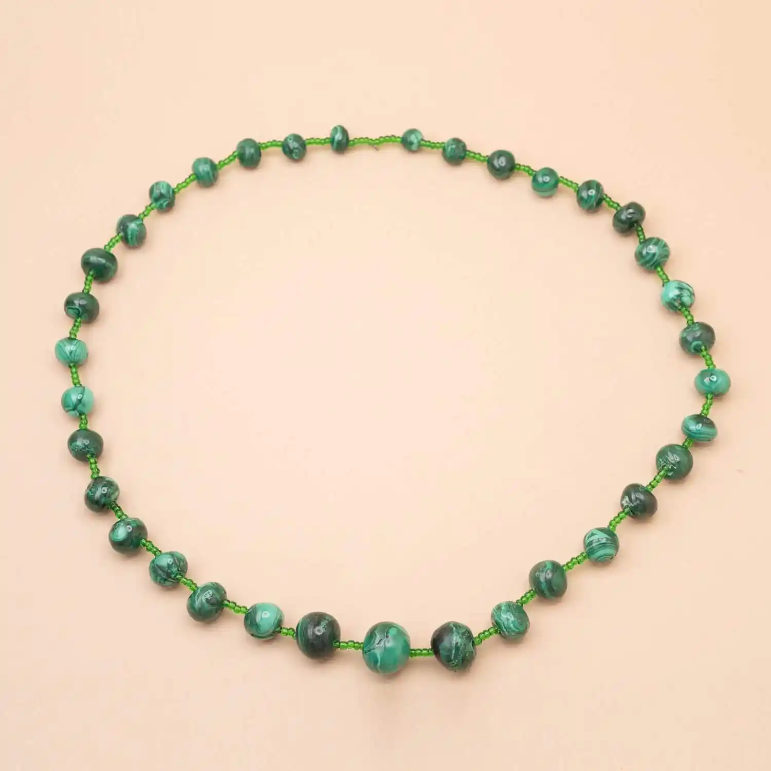 Collier en chute de perles de malachite alternées de perles de verre vertes