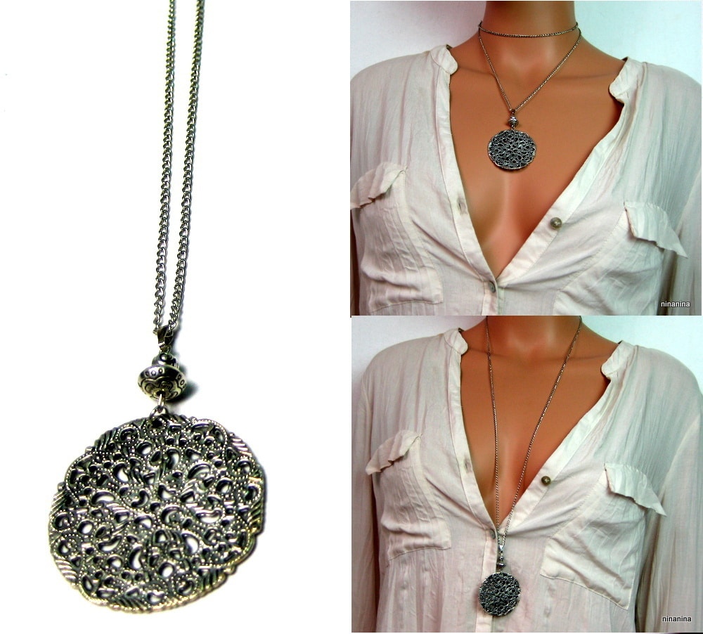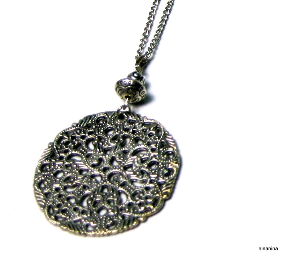 Collier long métal argenté filigrané composé de 2 perles et d’un pendentif rond filigrané en métal argenté montés sur fine chainette en métal argenté. Diamètre du pendentif : 4,3 cm. Longueur : 80 cm env. Fermoir mousqueton. Livré dans sa pochette d’organza. Bijou 100% fait-main.