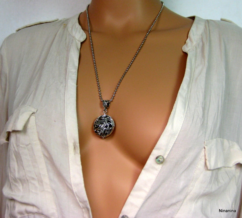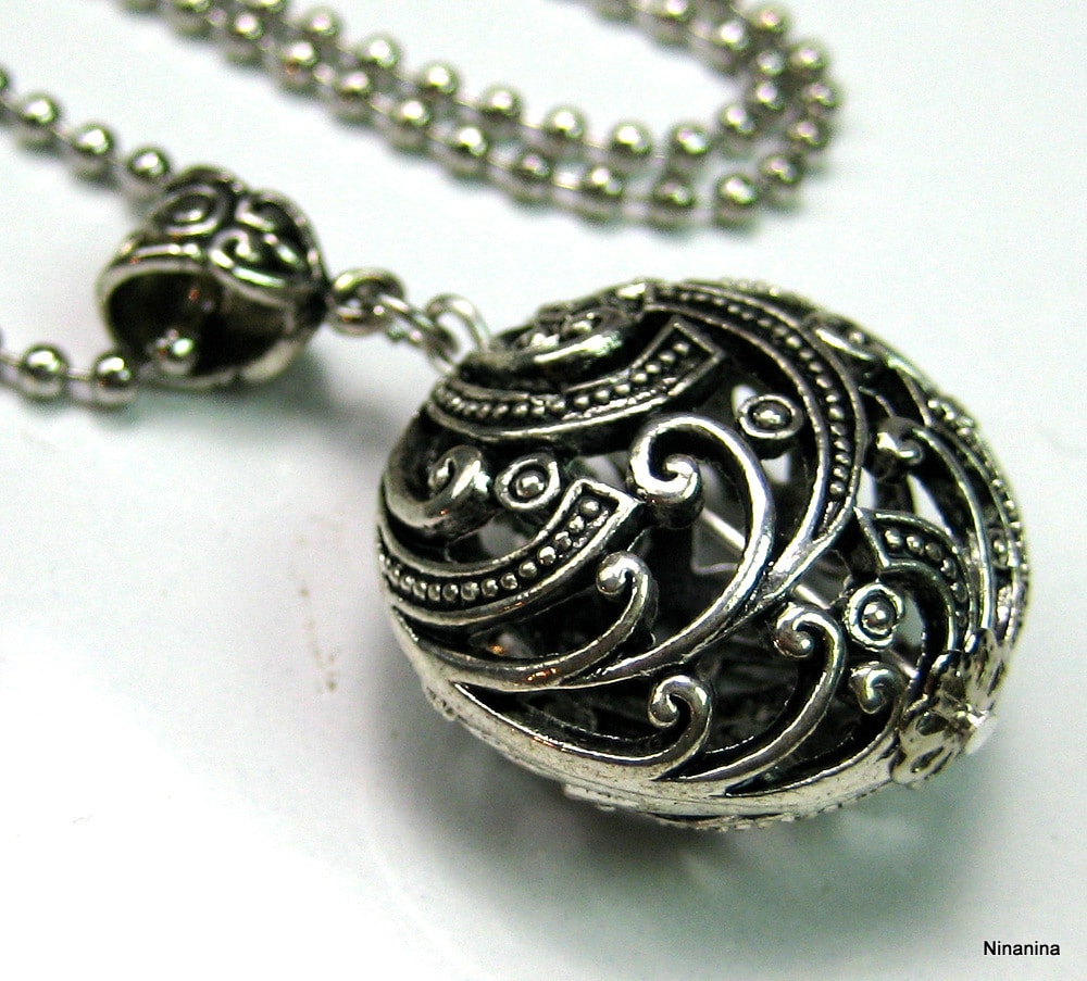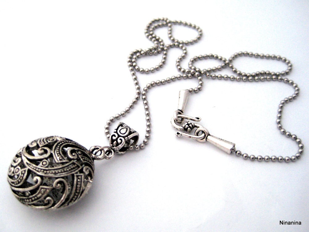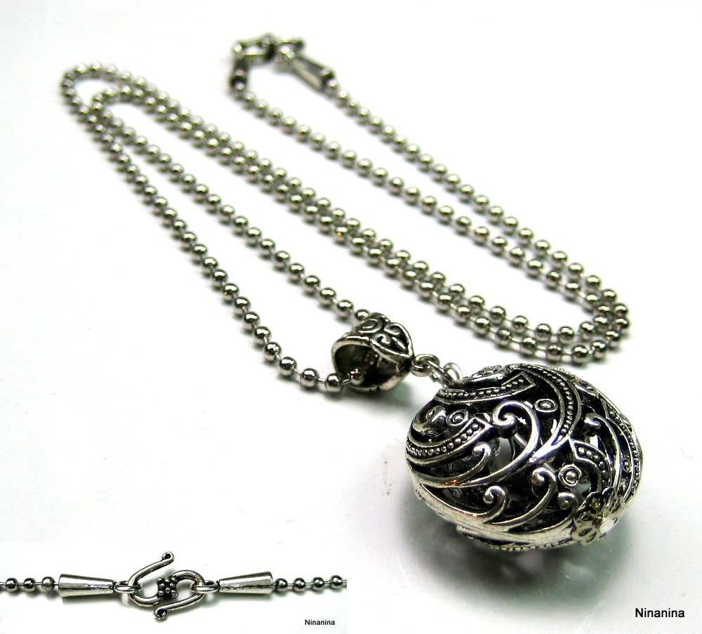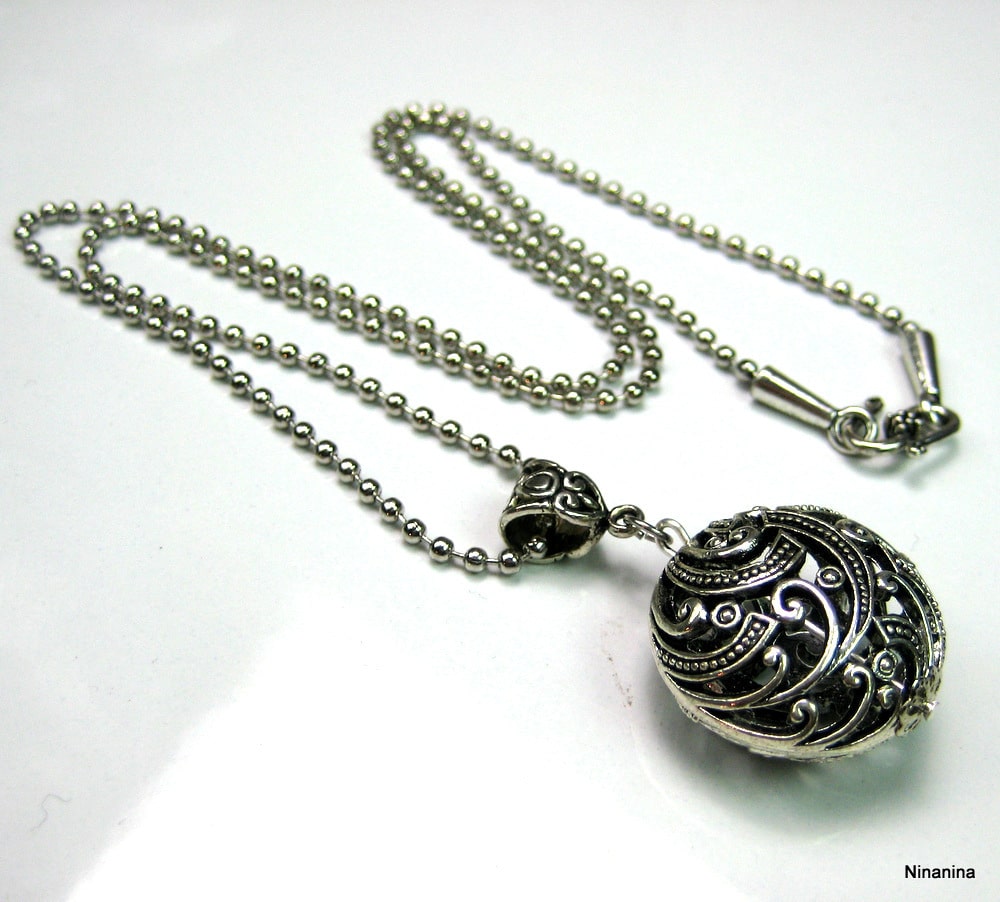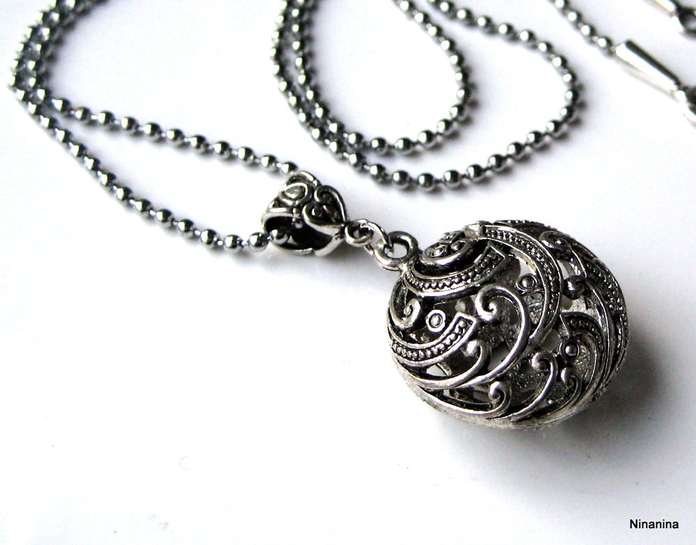 Collier mi long pendentif boule filigrané métal argent composé d’un pendentif filigrané rond et bombé et d’une bélière ciselée en métal argenté montés sur chainette boule. Dim du pendentif : 3,1 X 2,6 cm env. Longueur : 58 cm environ. Fermoir S ciselé. Livré dans sa pochette d’organza