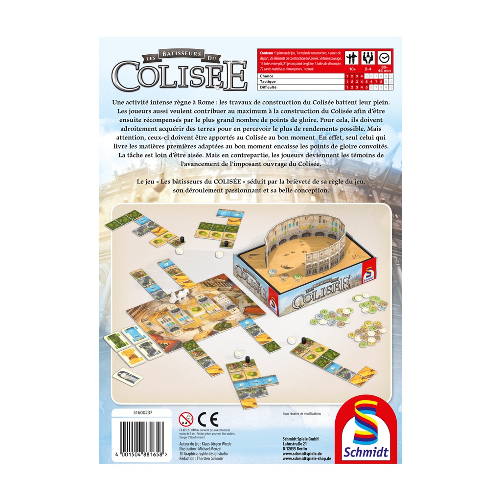La Rome antique … Une activité intense règne à Rome : les travaux de construction du Colisée battent leur plein. Les joueurs aussi veulent contribuer au maximum à la construction du Colisée afin d’être ensuite récompensés par le plus grand nombre de point de gloire. Pour cela, ils doivent adroitement acquérir des terres pour en percevoir le plus de rendement possible. Mais attention, ceux ci doivent être apporté au Colisée au bon moment. En effet, seul celui qui livre les matières premières adaptées au bon moment encaisse les points de gloire convoitées. La tâche est loin d’être aisée. Mais en contrepartie, les joueurs deviennent les témoins de l’avancement de l’imposant ouvrage du Colisée.