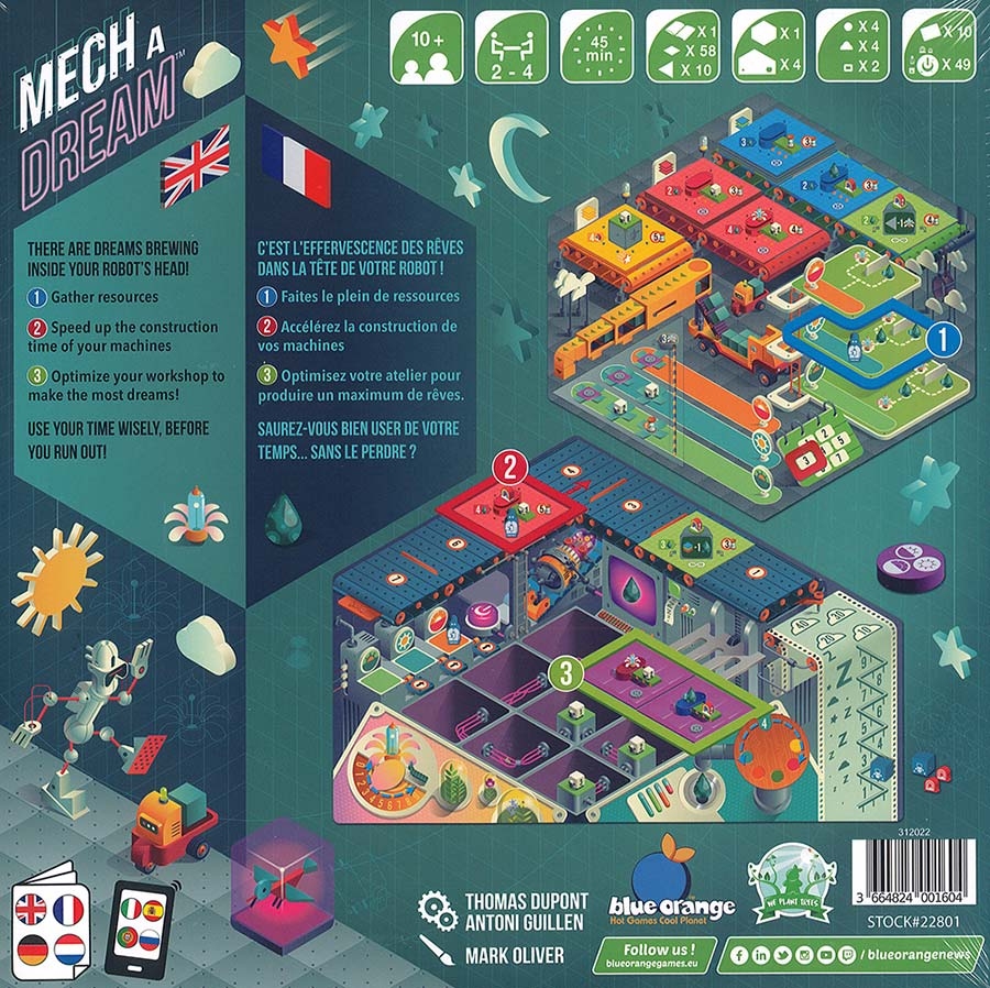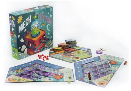 2143. Humains et robots se rendent mutuellement d’innombrables services. Les robots étant incapables de rêver, les humains démarrent la construction de machines à rêves pour les satisfaire le mieux possible. Dans Mech A Dream, vous devrez optimiser votre temps et vos actions. Entre la récolte des ressources et le placement de vos ouvriers, faîtes preuve d’anticipation à chaque phase de jeu.