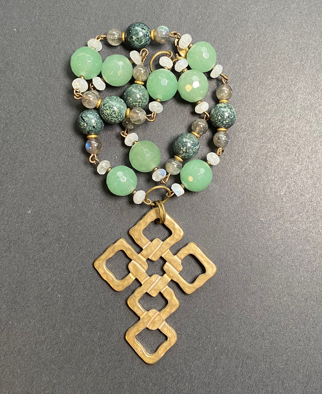 Pendentif Croix Entrelacs Grand Modèle en Bronze monté sur un ras de cou en DUO de pierres véritables d’aventurines facettées & perles de jaspe kambaba, ornées de petites labradorites rondes et de pierres de lune facettées. Un bijou entièrement réalisé à la main.