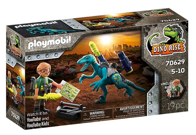 La boite contient 19 pièces dont un dinosaure, un personnage, ainsi que plusieurs accessoires de combat.