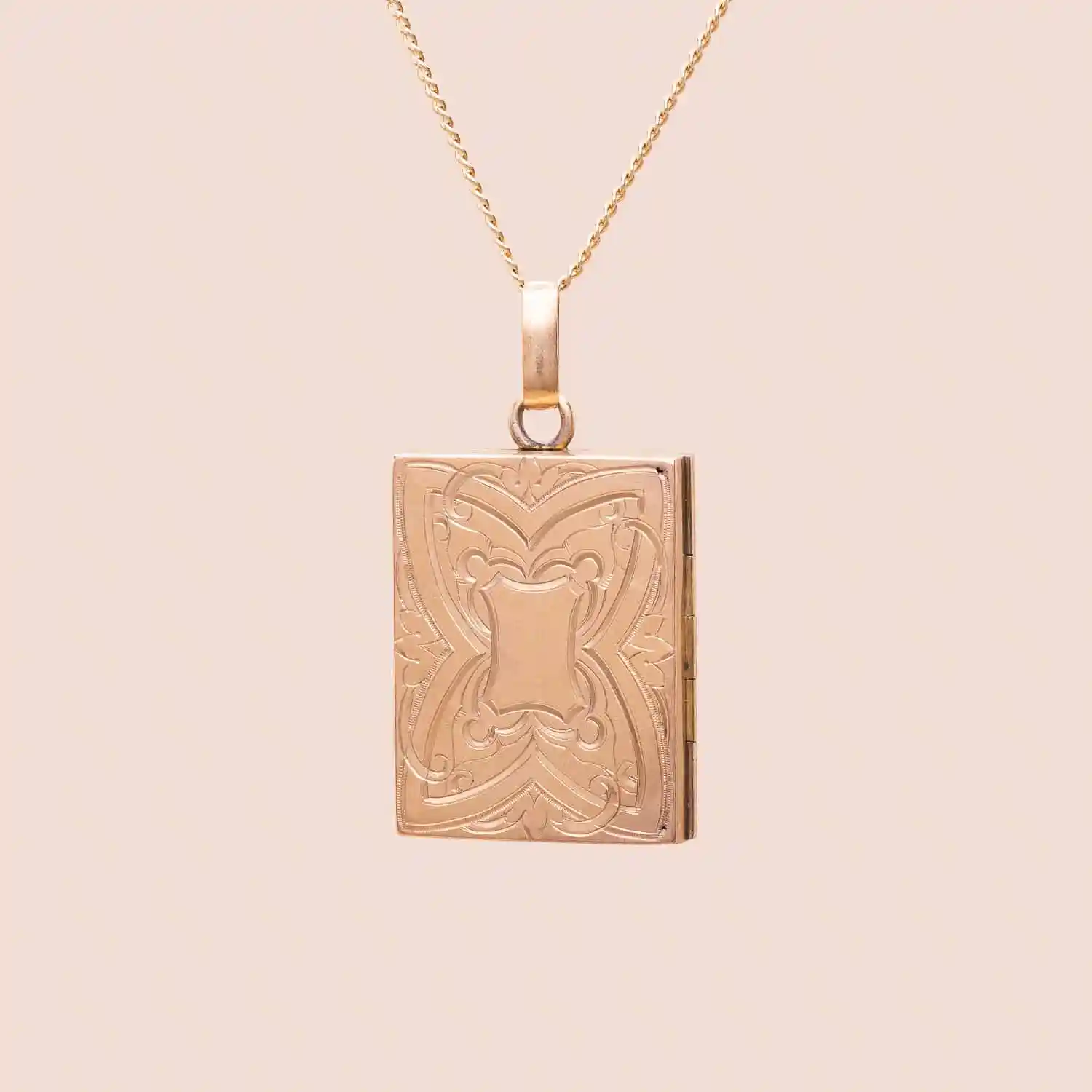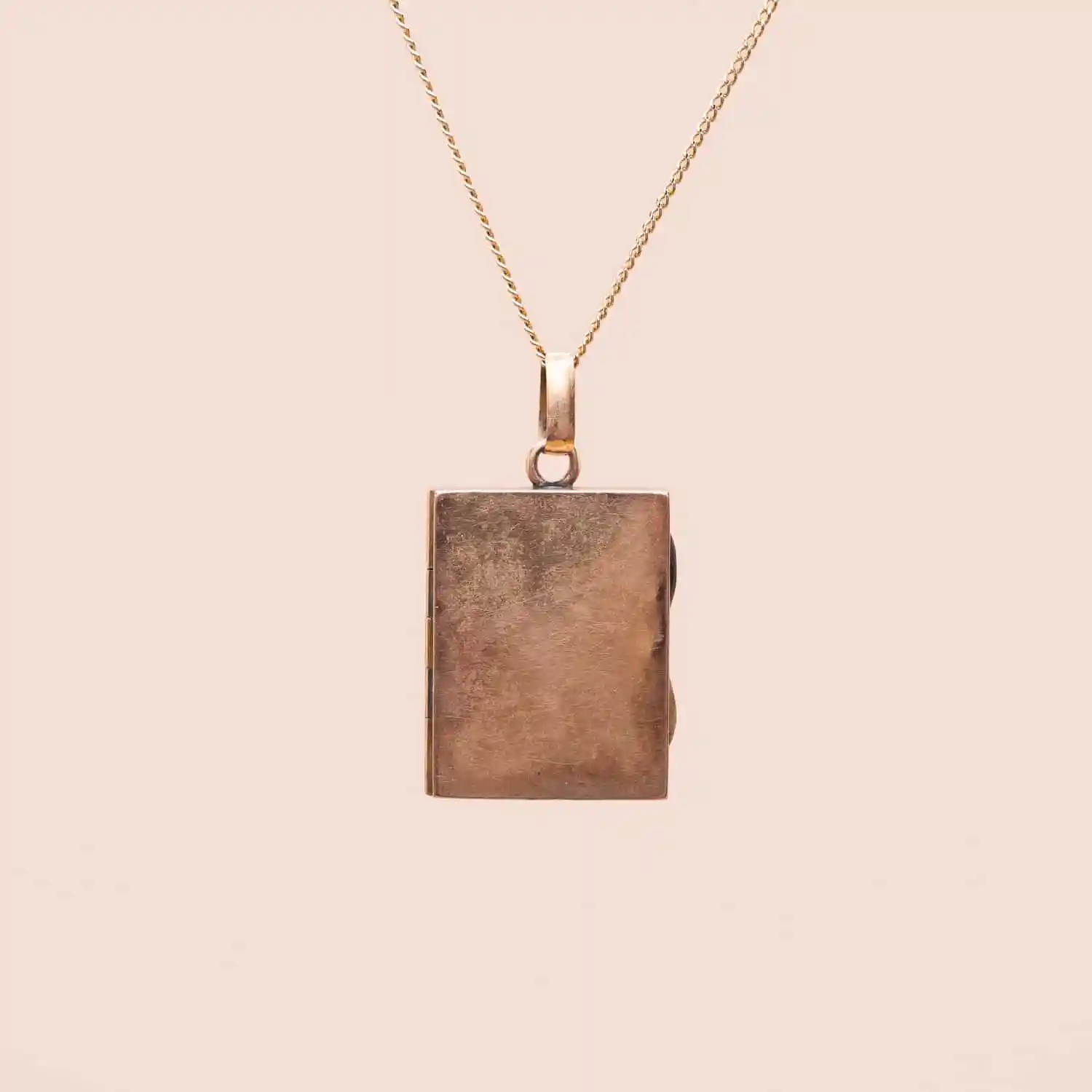 Pendentif porte souvenirs en or rose prenant la forme d’un livre en or à motif de quartefeuille gravé sur le dessus