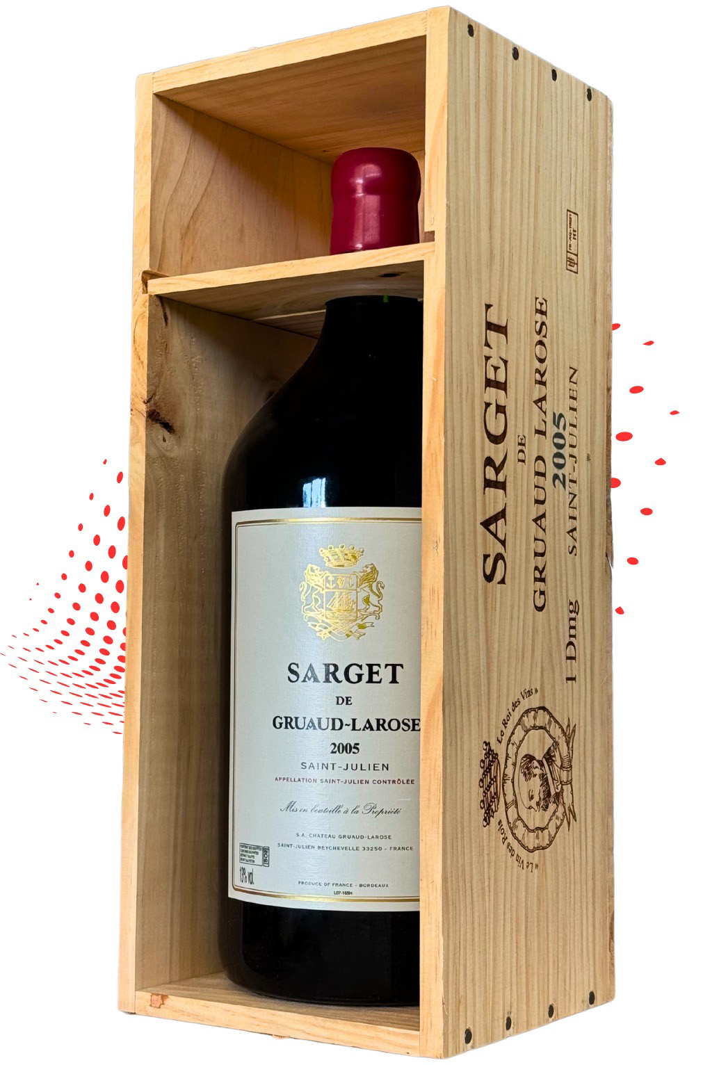 Ce double magnum (3 litres) de Sarget de Gruaud Larose 2005 est proposé en caisse bois.